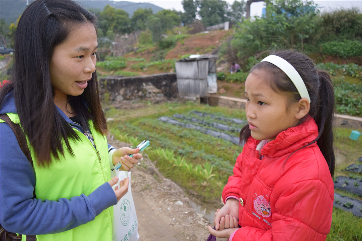 图为草根助学会志愿者钟瑜与李××芸同学(右)