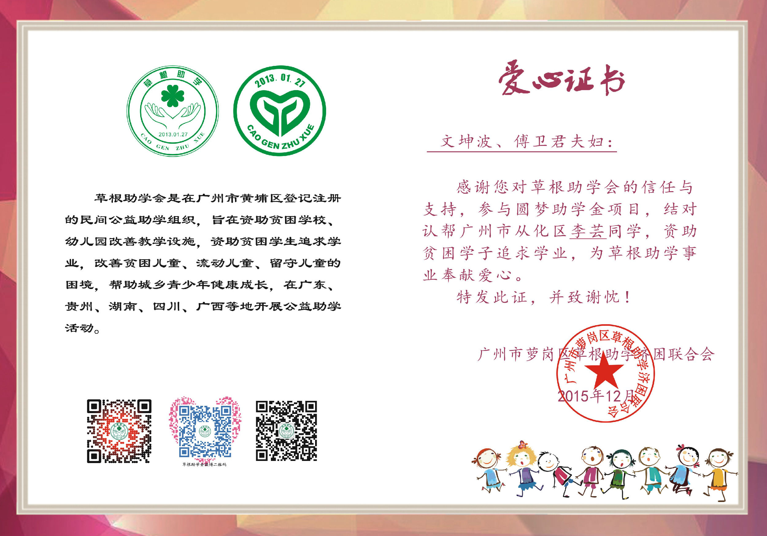 2015年12月15日,文坤波夫妇认帮,每月助学金200元;2015年12月22日,捐赠首笔助学金600元。