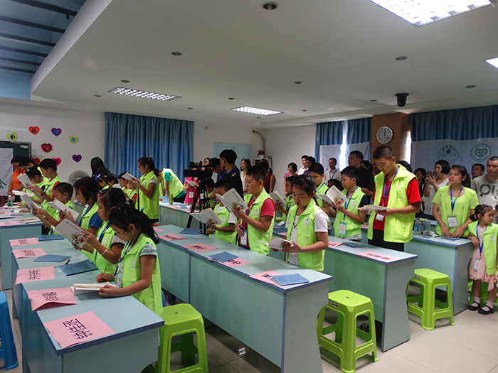 介绍完毕,志愿者代表钟晓明和黄雨菲上台发言,向大家介绍了她们参加夏令营志愿者的初衷和期待。接着,营员代表陶陶茜和毛咏怡也上台说出了他的心声。“今天,我很高兴,参加了草根助学会的夏令营,爸爸妈妈可以安安心心上班去。”
