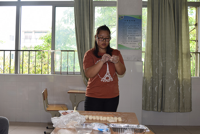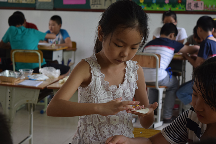最后,是营员们期待了一天的包饺子课。志愿者钟晓明老师给大家示范了饺子皮是怎样从面粉一步步做成的,在这过程中还和大家讲起了饺子的历史,也教大家要珍惜来之不易的食物,擀好饺子皮之后,老师向大家讲解了包饺子的要领并做示范,大家便迫不及待地自己动手包了起来,三角形,长方形,元宝形等形状各异的饺子一个个诞生,看到自己和其他营员包的饺子,大家都忍俊不禁。自己动手,丰衣足食。等到饺子出锅,大家都吃的津津有味,吃完一个又一个,营员们说今天晚餐都不用吃了。