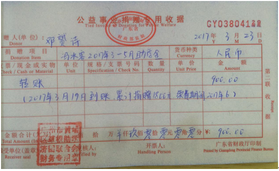 近日,有爱心人邓赟诗女士向贵州省遵义播州区受助学生冯水容捐赠2017年3-5月助学金900元,累计捐赠1800元。感谢爱心人士的善举,好人一生平安。