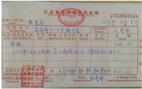 近日,有爱心人张桂芬女士向清远市阳山县受助学生蓝国涛捐赠2017年5-7月助学金600元,累计捐赠1800元。感谢爱心人士的善举,好人一生平安。