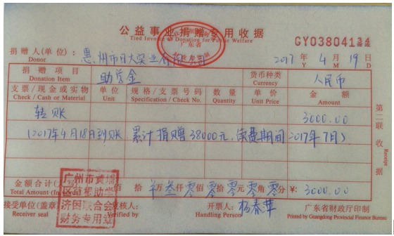 今日,惠州市日大实业有限公司向遵义寒门学子捐赠助学金3000元。累计捐赠38000元。感谢爱心企业的善举,好人一生平安。