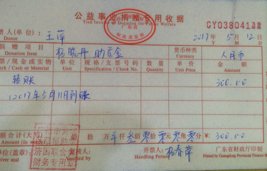 近日,有爱心人士王萍女士向清远阳山寒门学子杨晓丹捐赠助学金300元。感谢爱心人士的善举,好人一生平安。