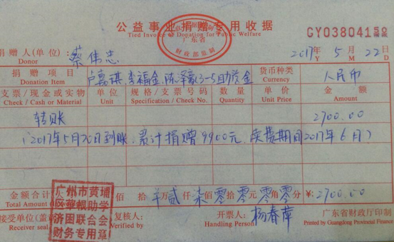 近日,有爱心人蔡伟忠先生向广州从化区受助学生卢嘉琪,李福金,陈泽豪捐赠2017年3-5月助学金2700元,累计捐赠9900元。感谢爱心人士的善举,好人一生平安。