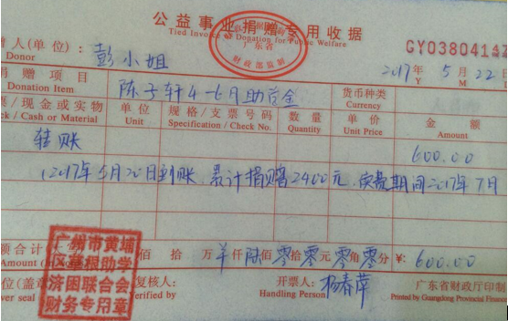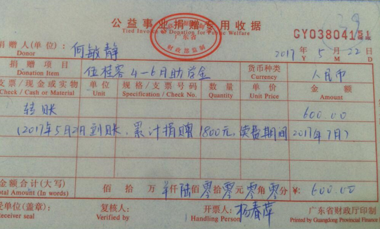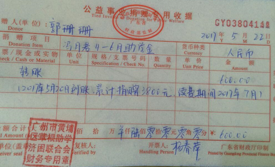 近日,有爱心人郭珊珊女士向广州从化区受助学生冯月君捐赠2017年4-6月助学金600元,累计捐赠3800元。感谢爱心人士的善举,好人一生平安。