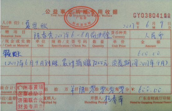今日,今有爱心人夏思欣女士向梅州市丰顺县受助学生陈秀春捐赠2017年6-8月助学金600元,累计捐赠7200元。感谢爱心人士的善举,好人一生平安。