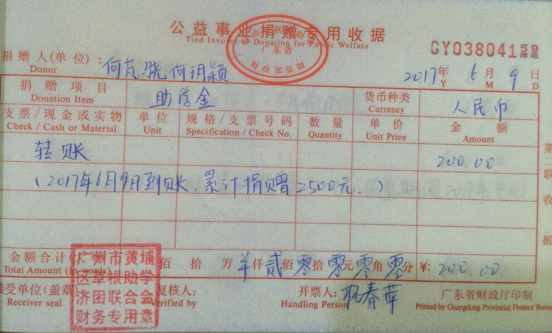 6月9日,广州小朋友何芃骁,何玥颖向寒门学子捐赠助学金200元,累计捐赠2500元。委托草根助学会寻找合适的受助学生发放。感谢爱心人士的善举,好人一生平安。