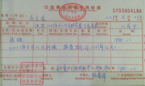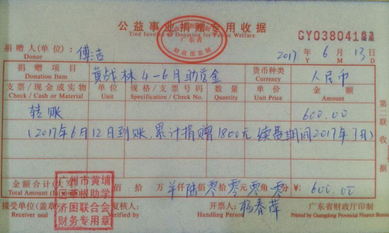 今日,有爱心人傅洁女士向清远市阳山县受助学生黄战林捐赠2017年4-6月助学金600元,累计捐赠1800元。感谢爱心人士的善举,好人一生平安。
