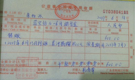 今日,有爱心人朱如冰女士向清远市阳山县受助学生蓝宝怡捐赠2017年4-6月助学金600元,累计捐赠1800元。感谢爱心人士的善举,好人一生平安。