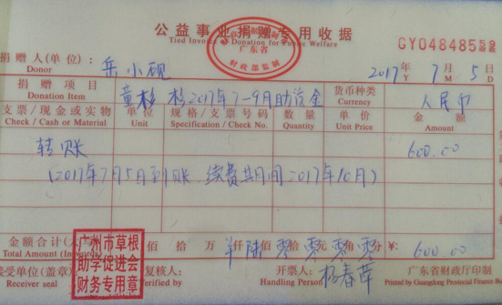 【贵州遵义贫困学生获认帮】7月5日,有遵义爱心人岳小砚向遵义受助学生童杉杉捐赠2017年7-9月助学金600元。感谢爱心人士的善举,好人一生平安。