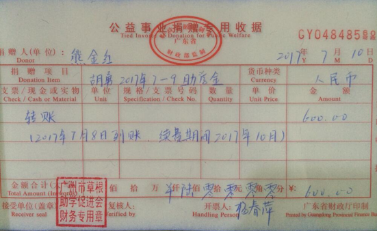 【贵州遵义贫困学生获认帮】7月10日,有广州爱心人熊金红向遵义受助学生胡勇捐赠2017年7-9月助学金600元。感谢爱心人士的善举,好人一生平安。
