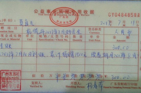 7月11日,有爱心人莫真儿女士向清远市阳山县受助学生杨晓丹捐赠2017年7月助学金300元,累计捐赠1500元。感谢爱心人士的善举,好人一生平安。