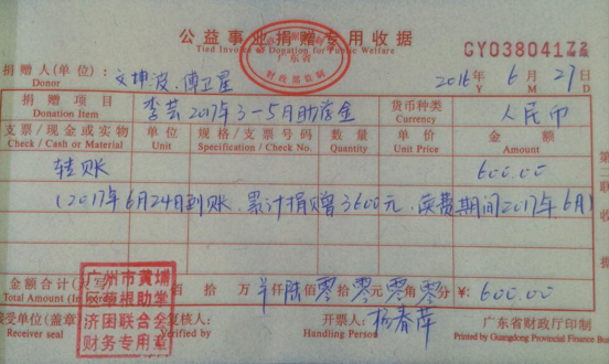 6月27日,有爱心人文坤波先生,傅卫星女士向广州从化受助学生李芸捐赠2017年3-5月助学金600元,累计捐赠3600元。感谢爱心人士的善举,好人一生平安。