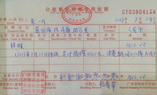 7月24日,有爱心人士朱一凡先生向清远阳山寒门学子捐赠助学金,蓝国强900元,陈诗雁600元。累计捐赠4500元。感谢爱心人士的善举,好人一生平安。