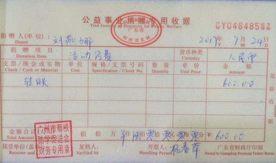 7月24日,草根助学会党支部书记刘燕娜女士向草根助学会捐赠活动经费600元。希望草根机构能持久运转,帮助更多的孩子。感谢爱心人士的善举,好人一生平安。