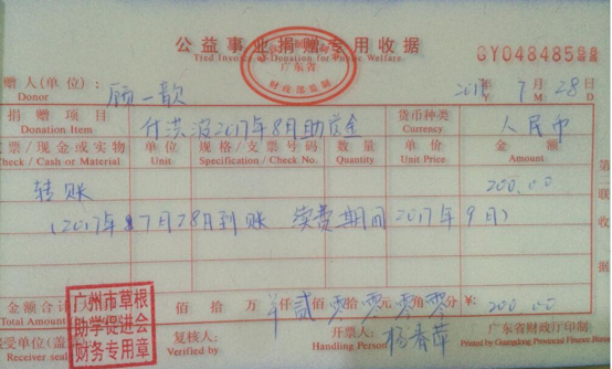 【贵州贫困学生获认帮】7月28日,有爱心人士顾一歆小朋友向遵义市贫困学生付洪波捐赠2017年8助学金200元。感谢爱心人士的善举,好人一生平安。