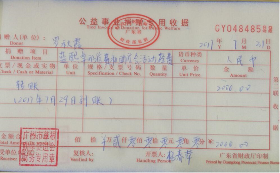 7月31日,有爱心人罗秋霞小姐向广州市天河区受助学生蓝熙卓捐赠高一第一学期的学费1175元,及草根助学会活动经费825元,累计捐赠2000元。感谢爱心人士的善举,好人一生平安。