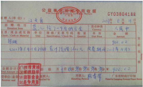 8月11日,有爱心人士江天勇先生向清远阳山寒门学子蓝沁怡捐赠助学金900元,累计捐赠3600元。感谢爱心人士的善举,好人一生平安。