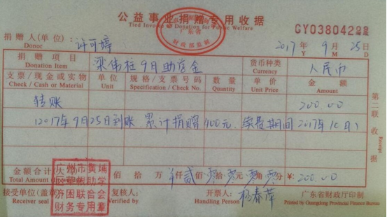 9月25日,有爱心人许可婷小姐向清远市阳山县受助学生梁伟柱捐赠2017年9月助学金200元,累计捐赠400元。感谢爱心人士的善举,好人一生平安。