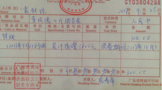 9月25日,有爱心人袁秋琼女士向清远市阳山县受助学生黄玫瑰捐赠2017年10月助学金300元,累计捐赠3600元。感谢爱心人士的善举,好人一生平安。