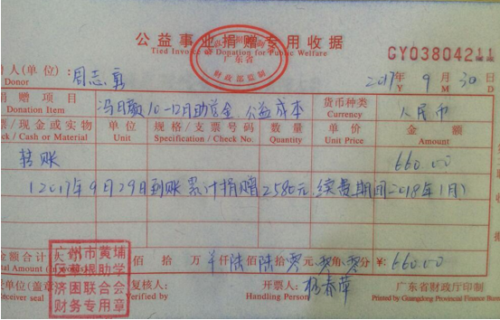 9月30日,有爱心人周志勇先生向清远市阳山县受助学生冯月颜捐赠2017年10-12月助学金600元,公益成本60元,累计捐赠2580元。感谢爱心人士的善举,好人一生平安。