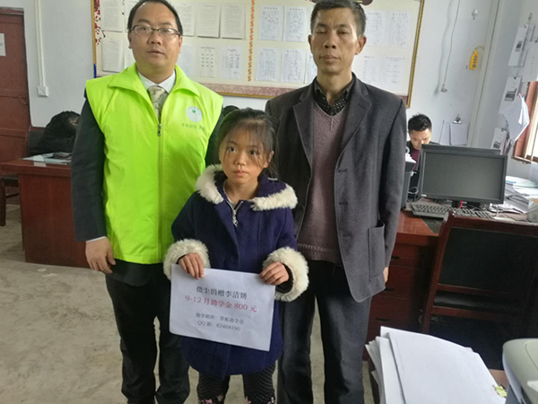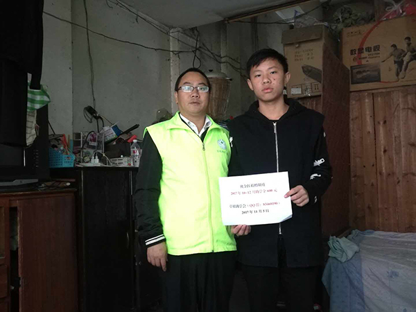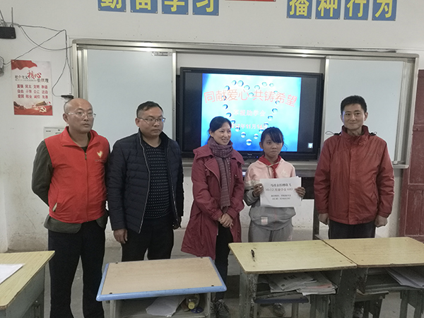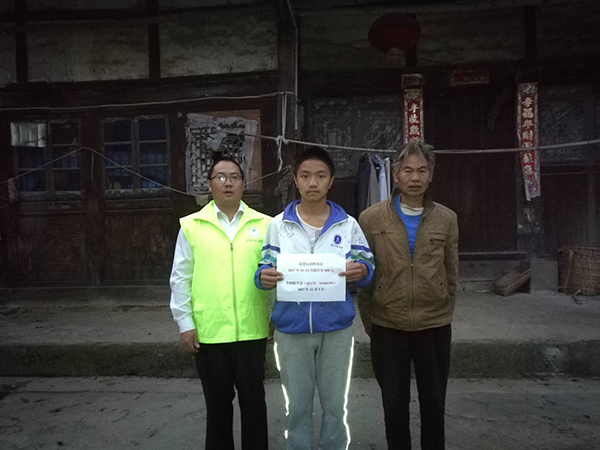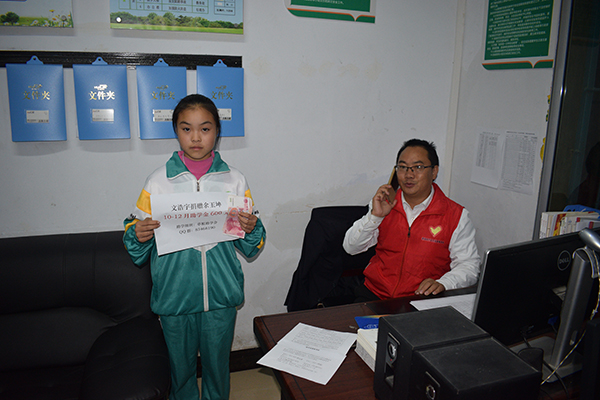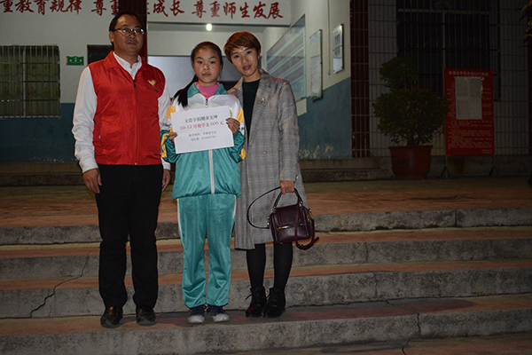 志愿者方伟坤、王正康等向红旗小学受助学生敬飞送上助学金