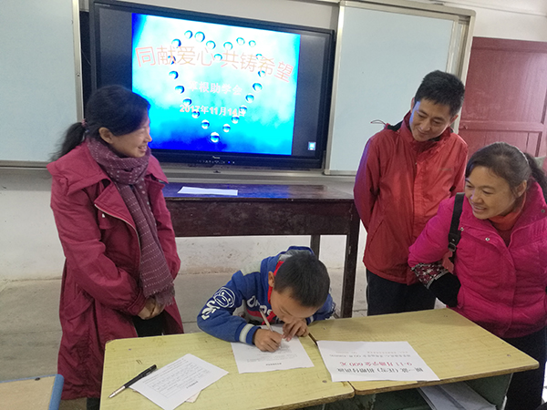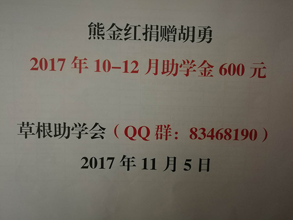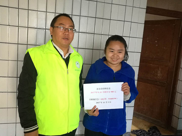 11月16日,在草根助学会的引荐下,爱心人士方伟坤先生一家来到了遵义市虾子镇红旗小学、习水市温水镇的知行中学进行助学考察,实地了解学校的情况,向受赠学生送达助学金。(草根助学会)