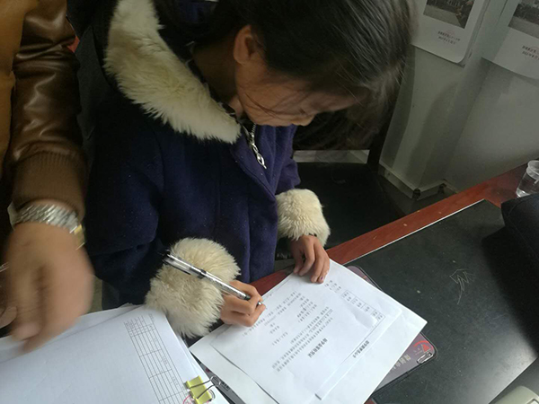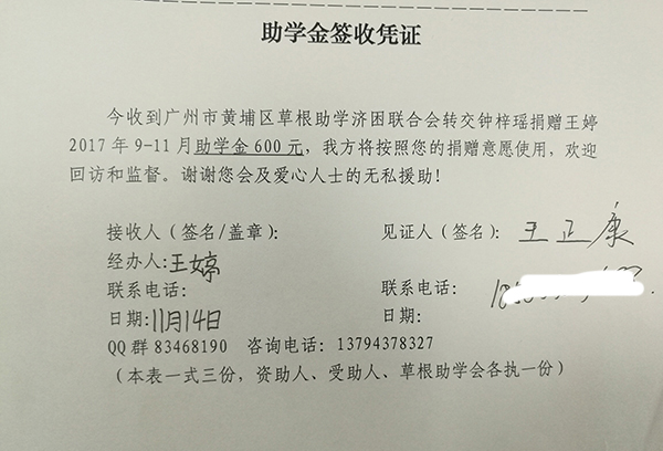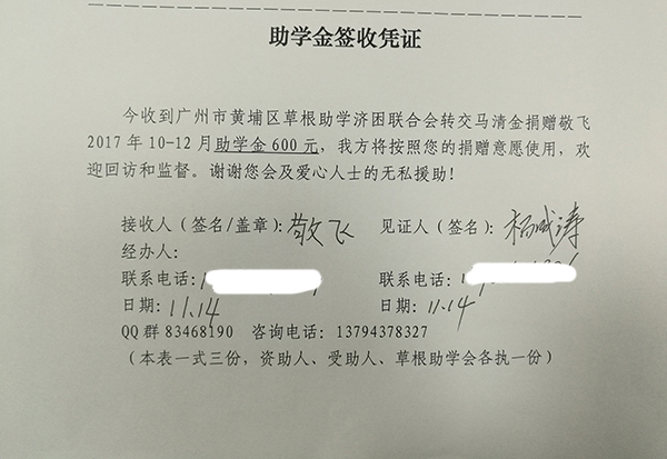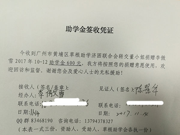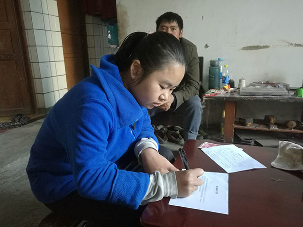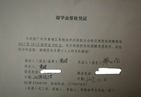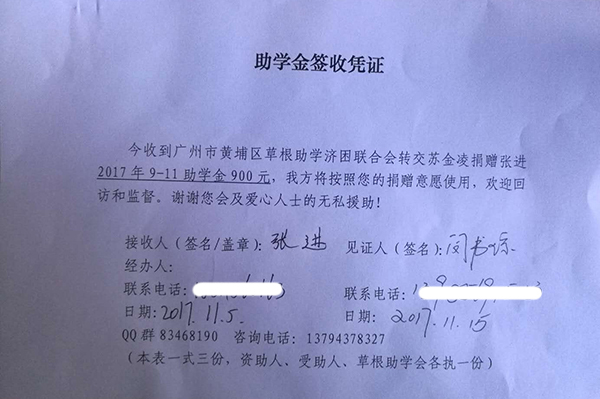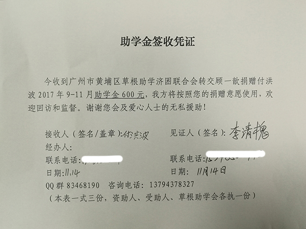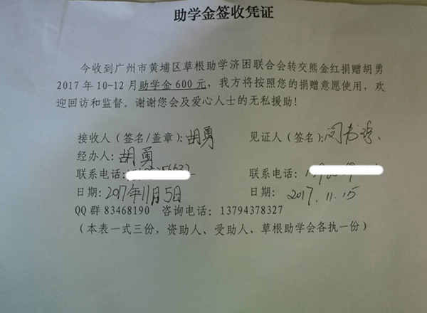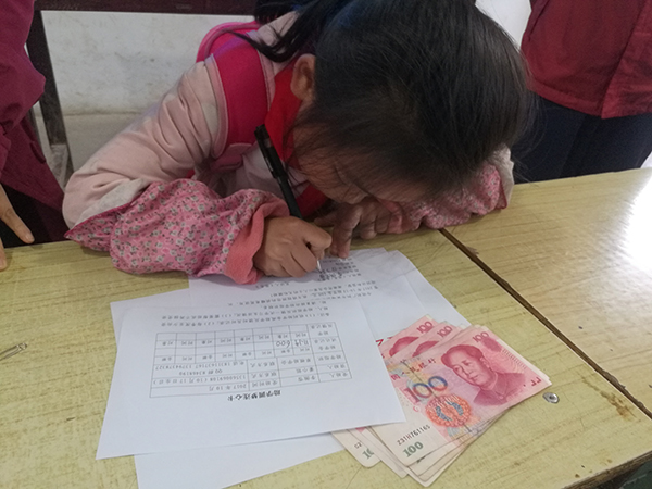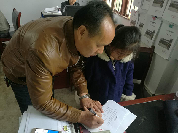 志愿者方伟坤夫妇指导付洪波签收助学金
