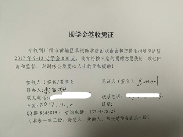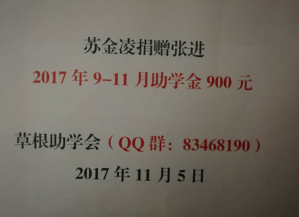 草根助学会情系寒门学子,爱心人士冬日送温暖。近日,草根助学会志愿者震君、康哥等人利用下班时间,先后走进遵义市虾子中学、六合小学、红旗小学,并在学校老师的见证下,向受助学生李傲雪、李洁妍、余玉坤等11名受助学生送上爱心人士捐赠的助学金,并与他们亲切地交谈,了解他们的学习情况以及家庭情况。受助学生们用质朴的语言写下了一封封感谢信来表达他们的心声和对爱心人士的感激之情,并表示要努力学习,用成绩来回报帮助他们的爱心人。此次发放的助学金共计8000元。