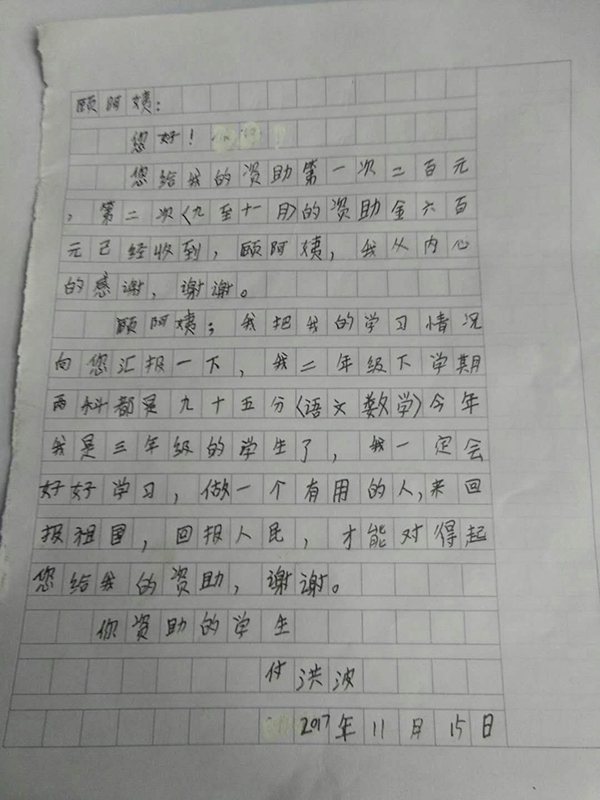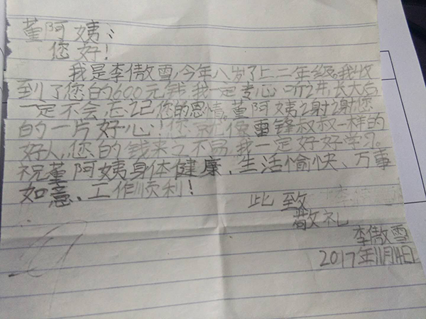 贵州省遵义市虾子镇红旗小学李傲雪致资助人董小姐的感谢信
