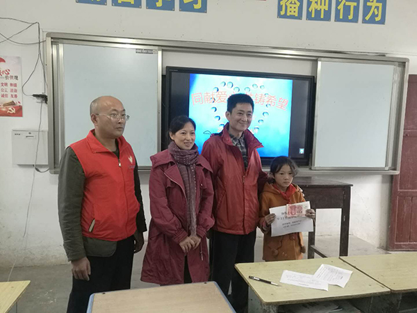 志愿者方伟坤夫妇与王正康向王婷送达助学金