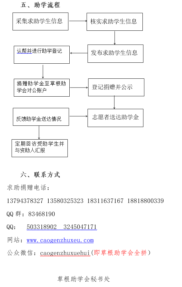为了方便资助人、志愿者有序参与草根助学会助学金项目,以及规范求助学生信息采集、发布及助学金发放工作、求助学生信息反馈工作,草根助学会秘书处特制定《草根助学会助学金工作指引》。