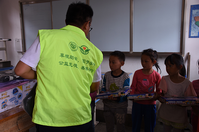 (二)活动其间,穿着草根助学会提供的志愿者服装。