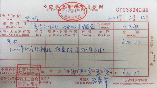 12月12日,有爱心人季惜先生向遵义受助学生吴洁捐赠2017年12月-2018年2月助学金600元。感谢爱心人士的善举,好人一生平安。