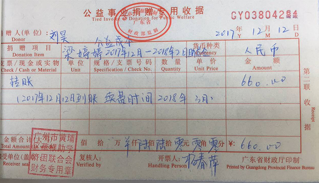 12月11日,深圳爱心人士唐尚梅女士捐赠徐娅2017年12月至2018年5月助学金1200元,感谢爱心人士的善举,好人一生平安。
