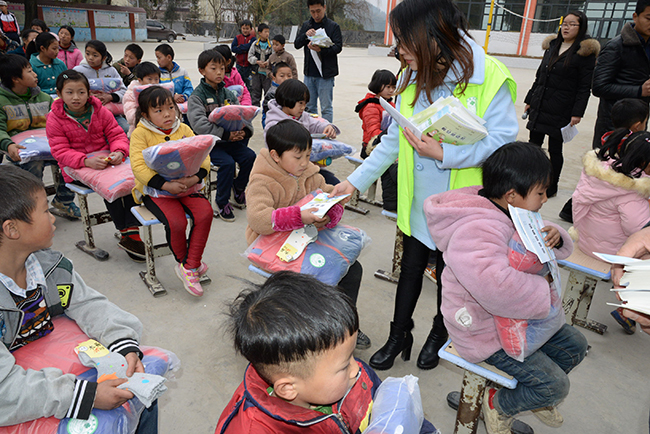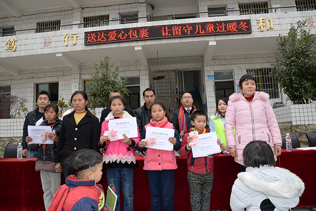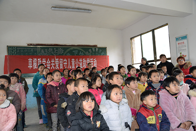趣味课程结束后,草根助学会的志愿者给到校的留守儿童们送上了冬衣套装、暖手袋、童袜、文具等价值近万元的助学物品,并为赵芳丽等四名品学兼优、家庭困难的学生每人送上了近三个月共计600元的助学金。