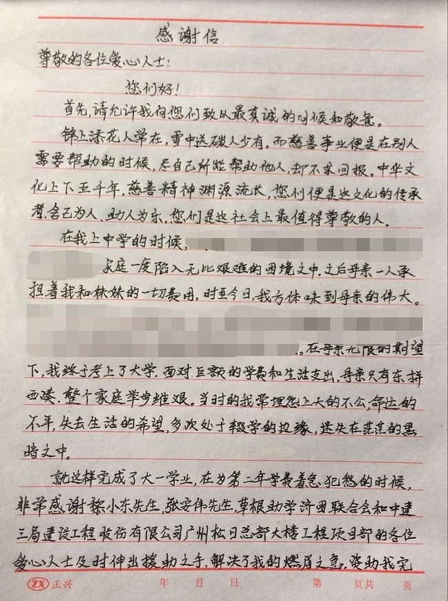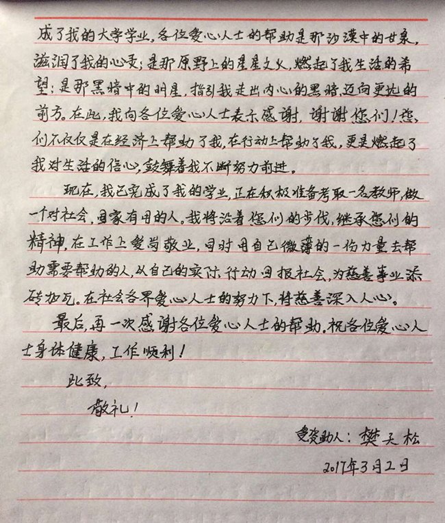 据了解,樊天松上中学父亲患上精神疾病,母亲不幸被烫伤,家庭一度陷入困境。在母亲的期盼中,樊天松同学勤奋好学,考上了大学,面对巨额的学费和生活支持,母亲只能东拼西凑,家庭举步维艰。正当樊天松在为大二学费发愁的时候,在草根助学会和热心人士张安伟先生引荐下,中建三局广州松日总部大楼项目部向樊天松捐赠大学期间的助学金3万元,委托草根助学会按学期发放学费、按季度发放生活费,解决了樊天松同学上大学期间的后顾之忧,得到顺利完成学业。