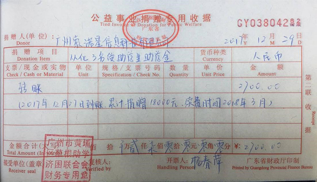12月29日,广州索诺星信息科技有限公司向从化3名寒门学子捐赠助学金:卢嘉琪900元;李福金900元;陈泽豪900元,共计2700元,累计捐赠18000元。感谢爱心企业的善举,好人一生平安。