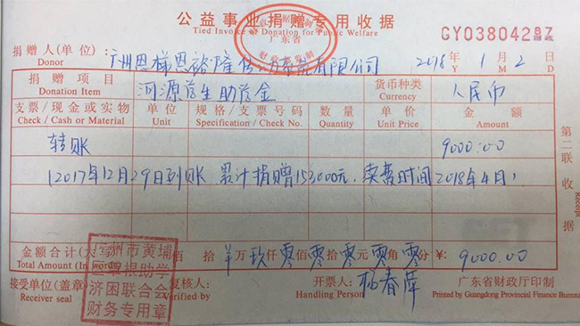 2018年1月2日,广州恩梯恩裕隆传动系统有限公司向河源寒门学子捐赠助学金9000元。累计捐赠153000元。感谢爱心企业的善举,好人一生平安。
