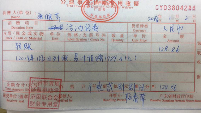 2018年1月2日,广州爱心人士,广州市草根助学促进会创始会员,监事张远芳女士捐献微店收入128.86元,累计捐赠1989.41元。支持草根学业。感谢爱心人士的善举,好人一生平安。