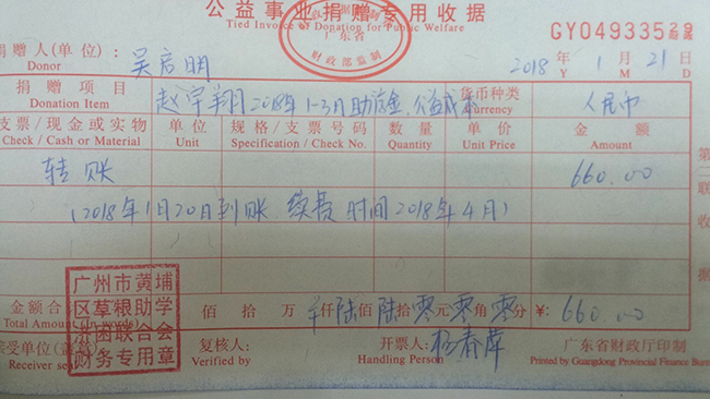 【遵义贫困学生获认帮】2018年1月21日,有广州爱心人吴启明先生通过草根了解,认帮遵义贫困学生赵宇翔,并向其捐赠2018年1-3月助学金600元,公益成本60元。感谢爱心人士的善举,好人一生平安。