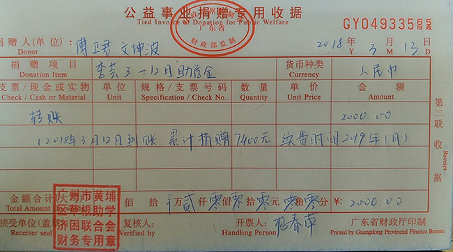 2018年3月13日,爱心人士傅卫君、文坤波夫妇向从化贫困学生李芸捐赠2018年3-12月助学金2000元,累计捐赠7400元,同时也寄来给李芸买的书籍,委托草根志愿者帮忙送达。感谢爱心人士的善举,好人一生平安。