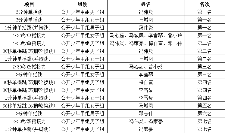 冯伟炎勇夺公开少年甲组男子组3分钟单摇跳、1分钟单摇跳(并脚跳)第一名,马城凤荣获公开少年甲组女子组3分钟单摇跳第一名。冯伟炎和马城凤都是大崀学校九年级的学生,参加跳绳训练才一年半时间,他们在赛后表示,取得这么好的成绩,来之不易,非常感动。