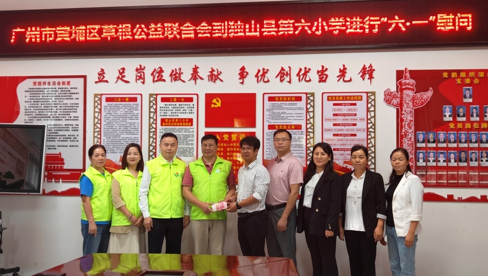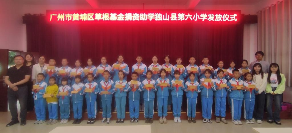 5月30日,草根公益联合会党支部书记刘义成、会长李阳、会员李静燕及专员何玉清一行来到基长镇独山第六小学,把草根家人们募捐的爱心款4000元,送到校领导手中,做为优秀学生的奖学金。