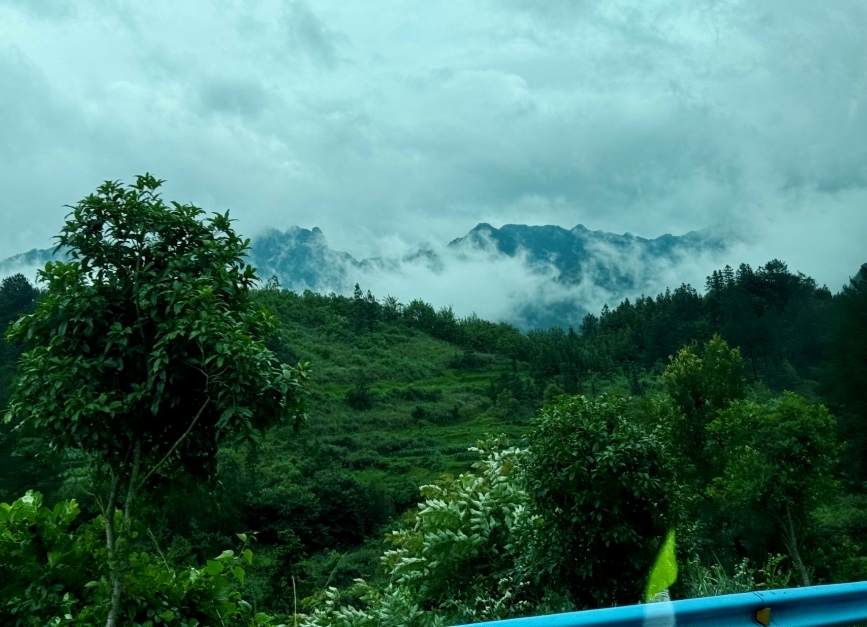 弯弯曲曲的山路不知经过多少个弯道,也不知到了多高的海拔, 看到窗外云雾缭绕的远山,才知已到高山上。