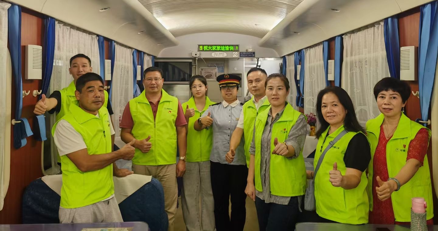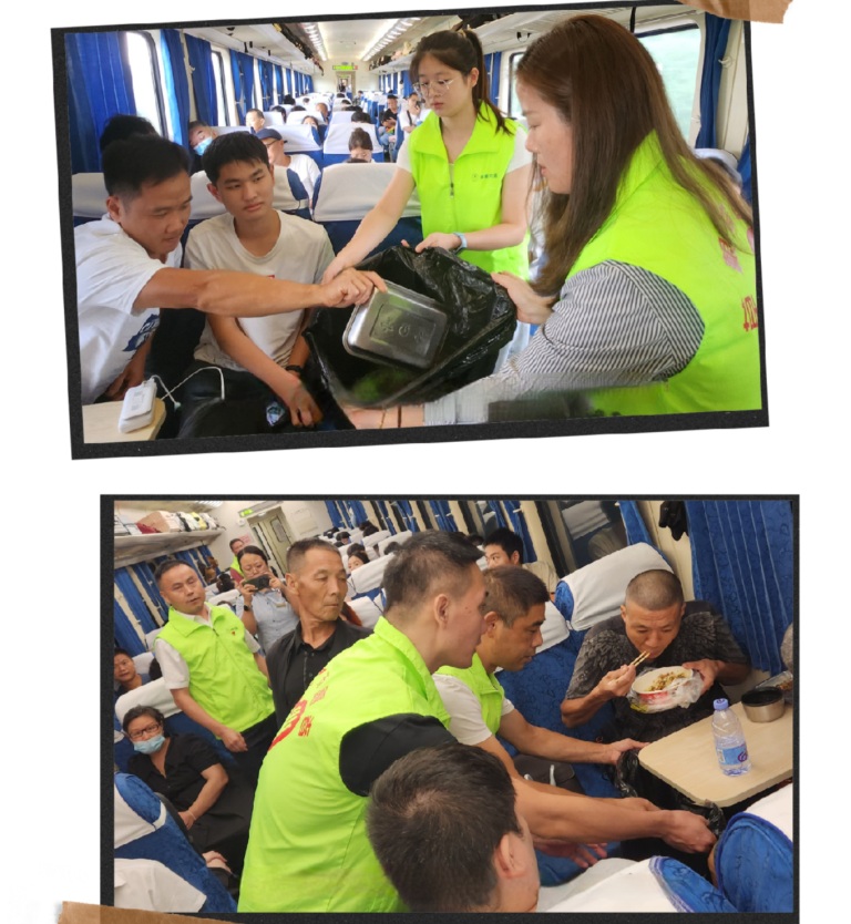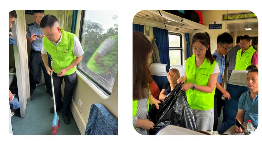 在列车上,党支部书记刘义成、会长李阳带领草根党员一行,配合乘务员打扫车厢卫生,收集清理垃圾杂物,协助乘务员保持车厢的整洁干净及通道顺畅。