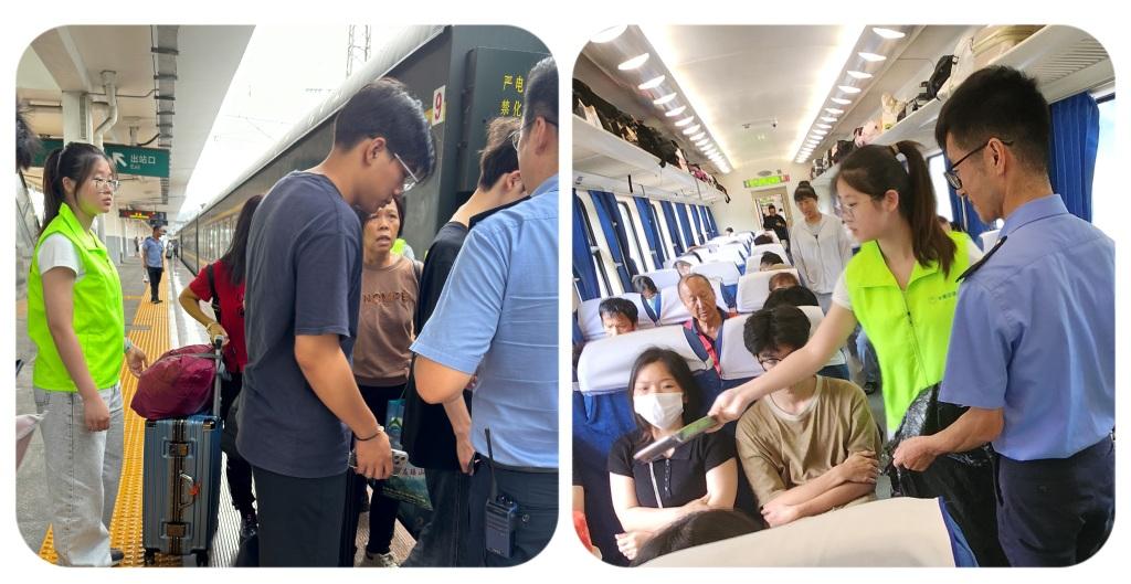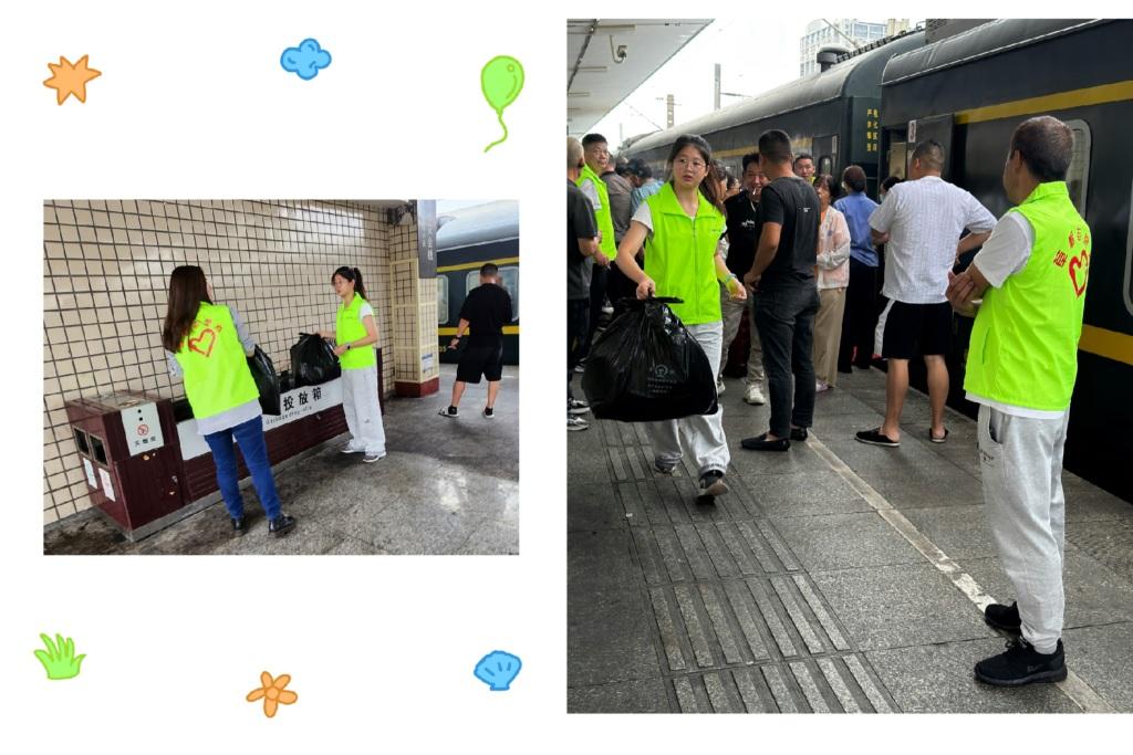 一行人中年龄最小的入党积极分子李晓渭抢先走在前面,主动拿起垃圾袋逐一到每个座位收集垃圾,到站后到指定垃圾站点投放垃圾;列车停站后立即跟随列车员引导旅客有序上下车,保持人员流动顺畅,帮助老人搬行李等力所能及工作。