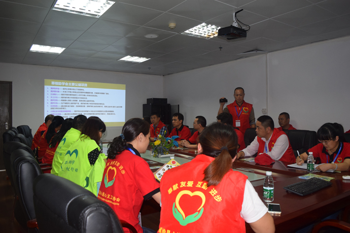 草根助学会负责人向蕉岭县心连心义工协会到访团一行介绍草根助学会