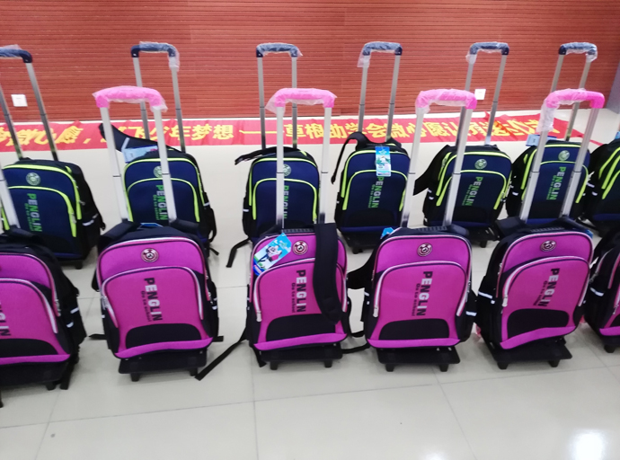 草根助学会秘书长刘燕娜、理事周巨波以及志愿者马大姐等一行人带着爱心人士们捐赠的心愿礼包早早来到联和小学等待孩子们下课,给他们送上梦寐以求的新书包。